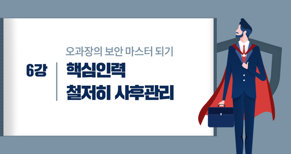 오늘은 우리회사 정보보안 환경 구축을 위한 그 여섯번째 시간으로 [핵심인력에 대한 사후관리]에 대한 내용을 다룰예정입니다.
