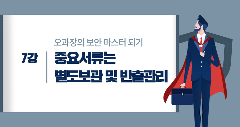 오늘은 우리 회사 보안 환경 구축을 위한 일곱 번째 시간으로 [중요서류는 별도보관 및 반출관리]에 대한 내용을 다루려고 합니다. 이번 시간에는 사내에서 규정해야 하는 문서관리 방안에 관한 내용뿐만 아니라, 관련 제도에 대한 내용을 설명해 드릴 예정이니, 집중해서 읽어주시기 바랍니다 😊