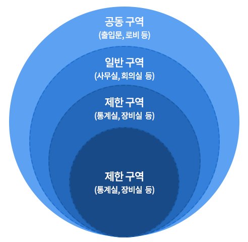 물리적 보안을 수립하기 위해서 가장 먼저 해야하는 것은 보호해야 할 구역을 정의하는 것 입니다. 외부인이 출입 가능한 구역과 내부 직원이 출입할 수 있는 구역을 구분하고 내부 직원 중에서도 특정한 허가를 받은 사람이 출입할 수 있는 구역을 분류하여 정의해야 합니다.
