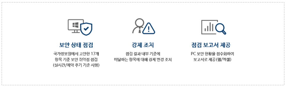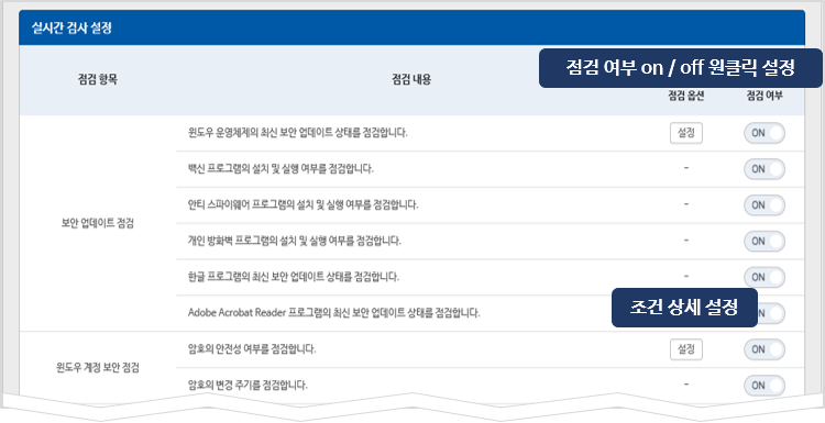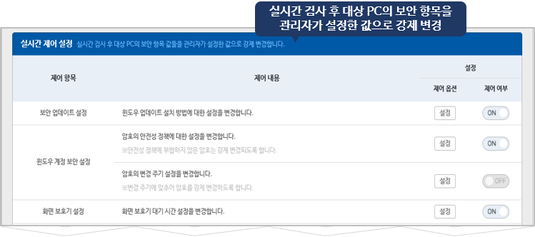 * 제어 항목 : 보안 업데이트, 윈도우 계정 보안, 화면 보호기, 공유 폴더, USB 보안, 기타