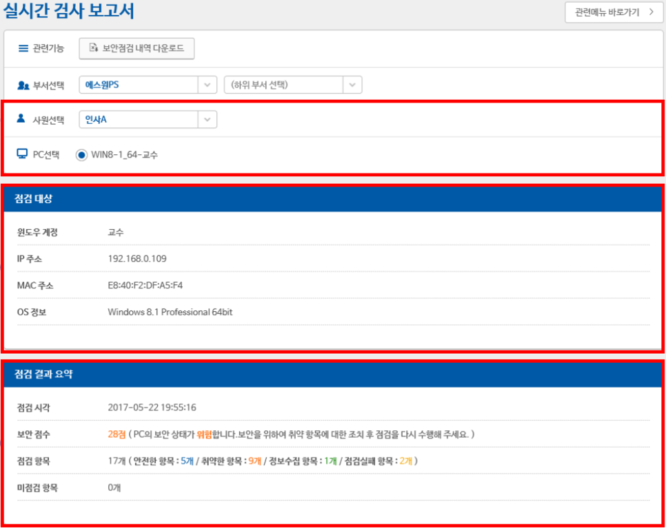 예약 검사 보고서에서는 부서 및 기간을 선택하여, PC취약점 점검 결과를 확인할 수 있습니다.