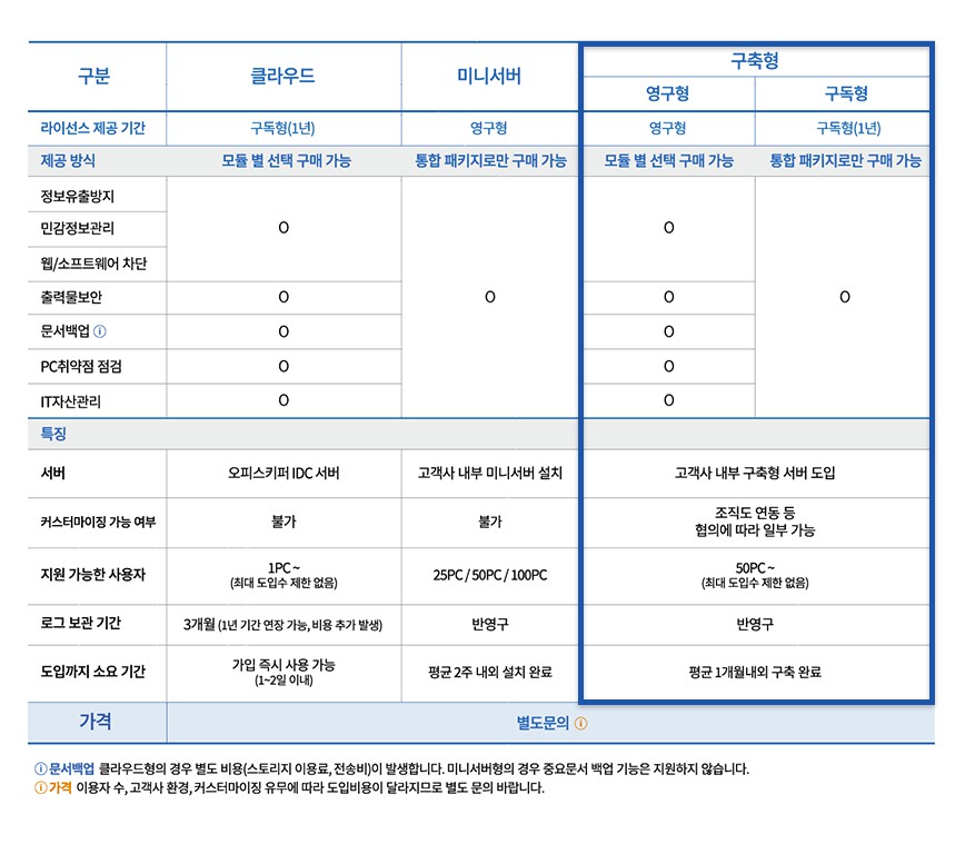 기존 클라우드, 미니서버, 구축형(영구형) 세가지 형태로 제공하였던 오피스키퍼에 구독형 서비스가 추가되어, 앞으로는 총 4가지 서비스로 제공 됩니다. 자세한 내용은 아래 오피스키퍼 가격 정책을 확인해주세요!