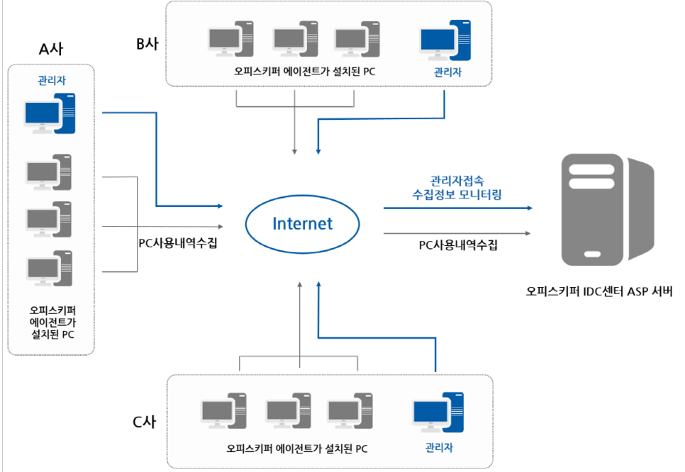오피스키퍼는 이러한 중소/중견기업의 어려움을 해결할 수 있도록 내부 서버 구축이 필요 없는 클라우드형 서비스 방식으로 설계되었으며, IT전문지식이 필요한 콘솔(Console)타입의 인터페이스 체계가 아닌, 보편적인 웹 서비스 UI로 구성된 관리시스템을 구성, IT 비전문가도 빠르게 적응 및 사용이 가능하도록 구성했다.