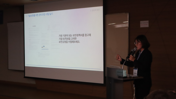먼저 첫 번째 세션은 한국폴리텍대학에서 교수로 재임 중이신 산업보안전문가 이숭희 연구원님의 “기업보안의 시작”을 주제로 강의가 진행되었습니다. 이숭희 연구원님은 2019년 보안 이슈, 중소기업 정보보안 현황 및 유출 사례, 정부지원사업을 통해 비용 감축하는 방법 뿐만 아니라 보안 인증제도 소개까지 알찬 강의를 진행해 주셨는데요. 보안 담당자에게 유용하고, 실제 적용 가능한 유익한 강의가 되었어요!