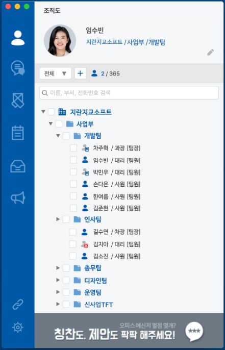 오피스메신저 Mac OS 버전은 기존 오피스메신저와 제공하는 기능은 동일하나, 사용성을 고려해 UI가 변경되었습니다.