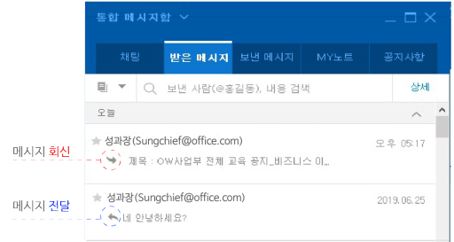 - 받은 메시지에 대해 회신 또는 전달 처리 여부를 아이콘으로 바로 확인이 가능합니다.
