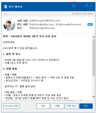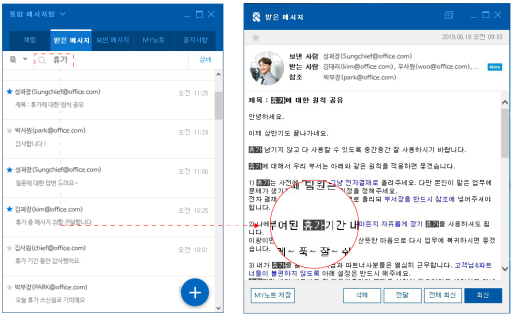 - 받은 메시지에 대해 회신 또는 전달 처리 여부를 아이콘으로 바로 확인이 가능합니다.