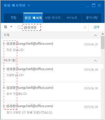 - 수/발신 메시지에서 "@이름" 검색으로 수신자 또는 송신자 검색이 가능합니다.