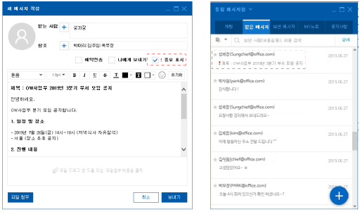 - 메시지 발신자가 중요 표시를 설정하여 메시지를 보내면 수신자 메시지에 중요 아이콘(!)이 표시됩니다.