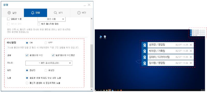 - 미니알림이 설정되면 새 메시지를 수신하였을 때, 보낸 메시지에 대한 수신확인 현황이 바탕화면에 차례로 쌓입니다.