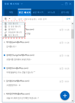 - 통합 검색창 앞에 빠른 필터가 추가되어(안 읽은 메시지, 즐겨찾기, 파일첨부 메시지, 중요 메시지) 메시지를 간편하게 필터링할 수 있습니다.
