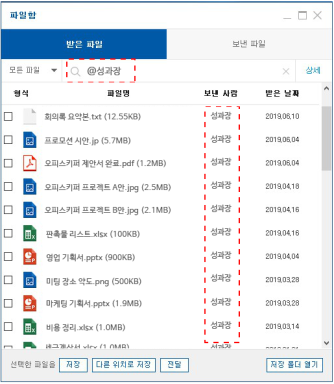 - 파일함에서 "@이름" 검색으로 수신자 또는 송신자가 받은/보낸 파일을 확인할 수 있습니다.