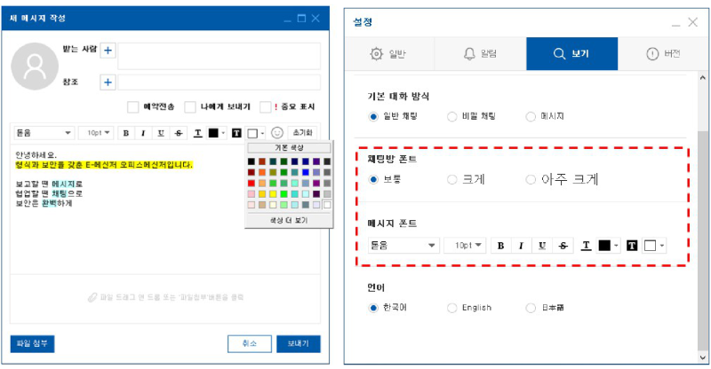 - 환경설정에서 메시지 기본폰트 설정이 가능합니다.