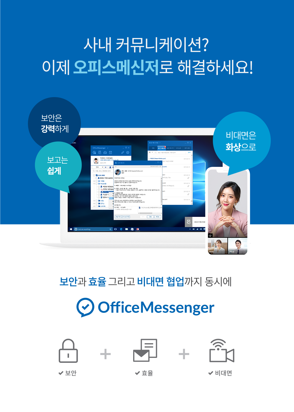 오피스메신저는 ▲원격제어, ▲화상회의 기능으로 재택 또는 원격근무 등 비대면 근무환경에서도 실시간 커뮤니케이션이 가능하여, 업무의 효율성과 연속성을 유지할 수 있는 기업용 협업 메신저 솔루션이다.
