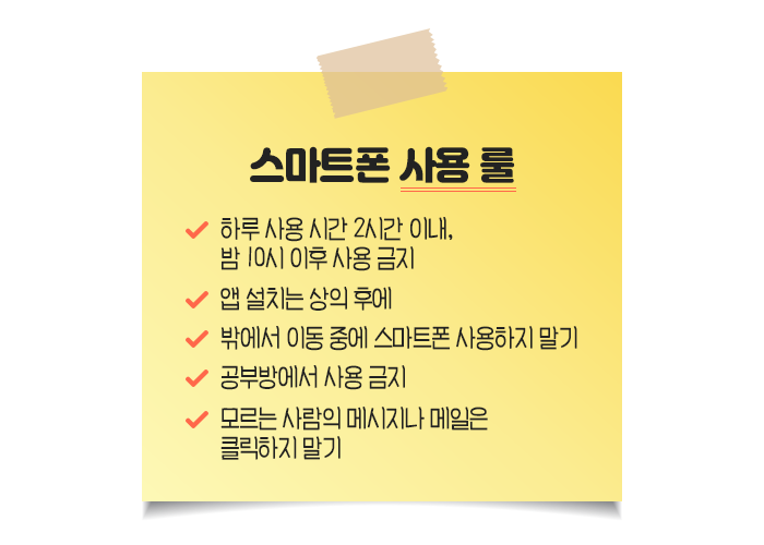 룰은 부모님께서 일방적으로 선포하는 것이 아니라, 아이들과 상의하고 타협한 후 정해주세요. 아이들이 직접 약속한 사항들을 지키도록 이끄는 것이죠. 스마트폰 사용 시간, 장소, 주의사항 등을 상황에 맞게 적용해주세요. 예를 들어 다음과 같은 룰이 만들어질 수 있겠죠.