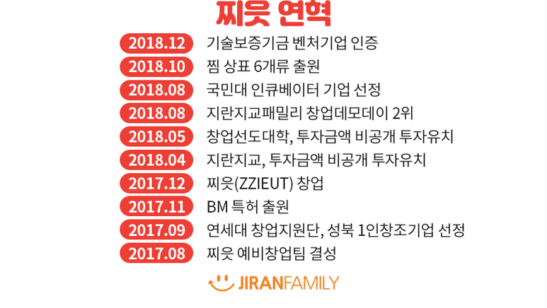 뭘 준비해야 되고 어떻게 해야 되고 하면 너무 할 일이 많아서 복잡해지기만 할 것 같고 ... 아마존의 창업 스토리 아시죠? 투자자들이 많이 다니는 횡단보도 신호등 아래에서 사업계획서 들고 무작정 부딪혔대요. 저도 그거 보고 오치영 CDO(Chief Dream Officer)님께 들이댄 거였거든요. 그렇게 행동할 수 있는 용기가 제일 중요하다고 생각해요. 그 용기의 원천은 자만이 아니라 확신이어야 해요. 내가 이만큼 준비했다는 확신이 들면 그 확신이 용기로 표출되죠. 사실 내가 준비한 것, 그게 틀렸을 수도 있어요. 하지만 그걸 확인하기 위해선 부딪히는 수밖에 없죠. 찌읏의 가능성을 알아봐 주신 지란지교와 오치영 CDO님께 감사드립니다. (웃음)