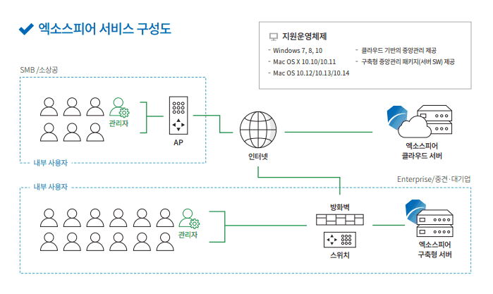 어플리케이션인 SaaS(Software as a Service)의 형태로 제공합니다. 최근 전세계 보안 업계에서 클라우드 기반 보안서비스인 SECaaS(Security as a Service) 형식에 역량을 집중하는 가운데, 지란패밀리에서도 글로벌 서비스를 염두에 둔 클라우드 기반 보안서비스를 런칭한 것입니다. 엑소스피어는 AWS(Amazon Web Service) 기반으로 제공됩니다. 세계 1위 점유율과 수많은 IT 인프라 구축 서비스를 제공하는 AWS에 바탕을 둠으로써, 보다 많은 기업이 보다 쉽게 이용할 수 있는 기반을 갖추었다고 하겠습니다.