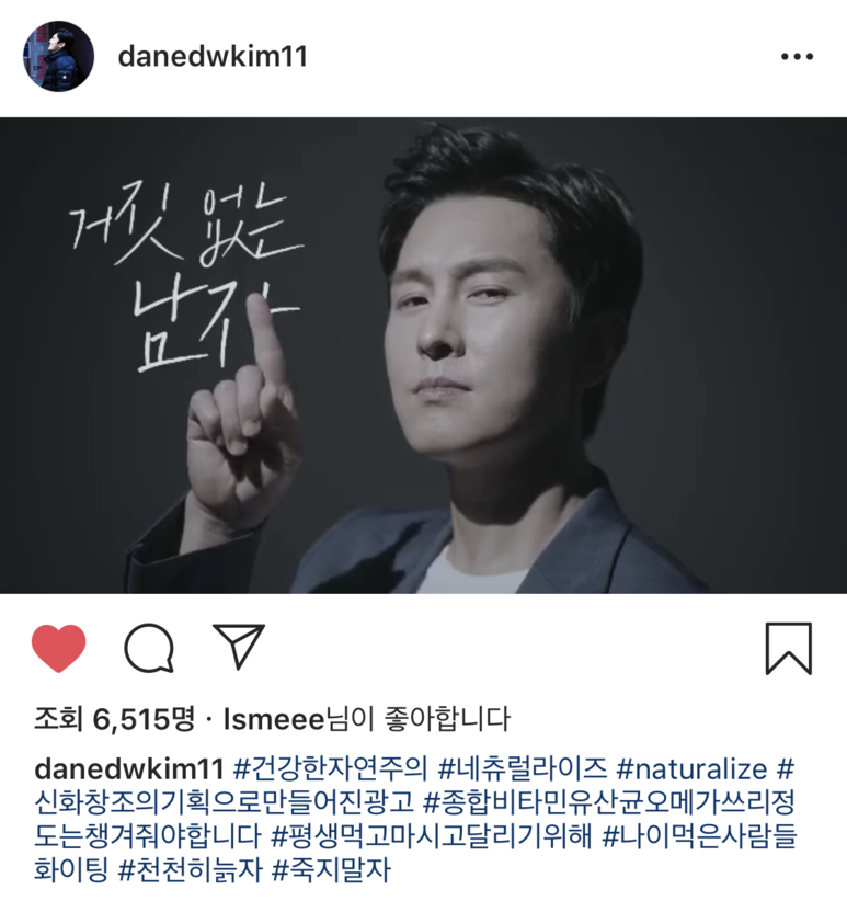 건강기능식품 브랜드 네추럴라이즈 광고기획을 맡았던 그녀는 광고대행사의 기획자입니다. 때마침 자신이 담당하던 브랜드의 광고촬영을 위한 광고모델 섭외가 필요했습니다. 네추럴라이즈의 대표적인 이미지인 #자연주의 #건강 에 연상되는 한 사람, 김동완씨 였다고 합니다.