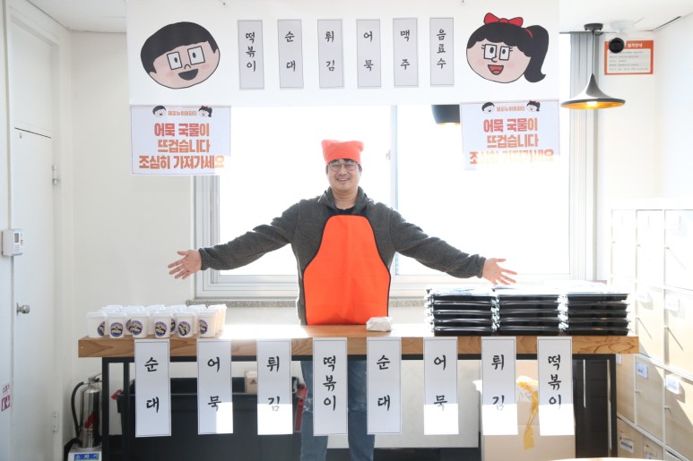 먹거리는 포장마차라는 컨셉이 정해지자 자연스럽게 떠올랐어요. 떡볶이와 튀김, 오뎅 등이 생각났고, 전에 거래를 했던 업체가 있어서 물 흐르듯 진행할 수 있었습니다.