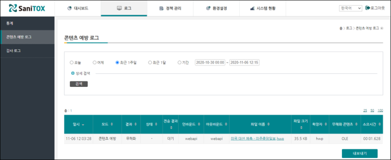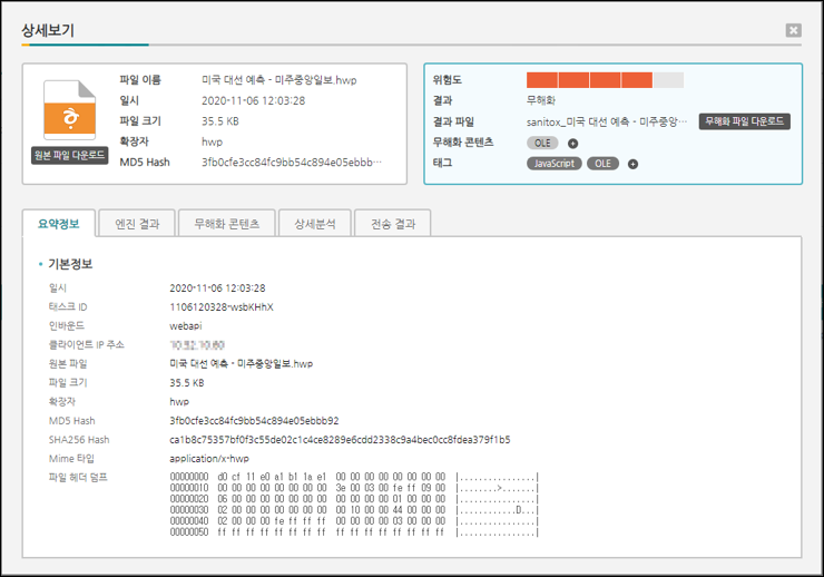 상세보기 창에서 “무해화 콘텐츠”, “상세분석” 탭 등을 통해 위협요소에 대한 자세한 정보를 확인할 수 있습니다.