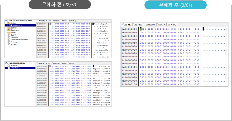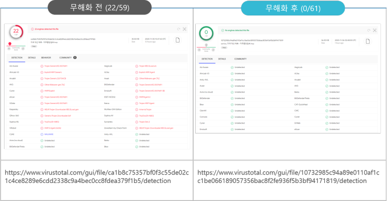 해당 한글파일을 바이러스 토탈 등을 통해 무해화 전/후 비교해보면 무해화 전에는 일부 바이러스엔진에서 바이러스가 발견되지만, 무해화 후에는 모든 안티바이러스엔진에서 바이러스가 없다고 보고되었습니다.