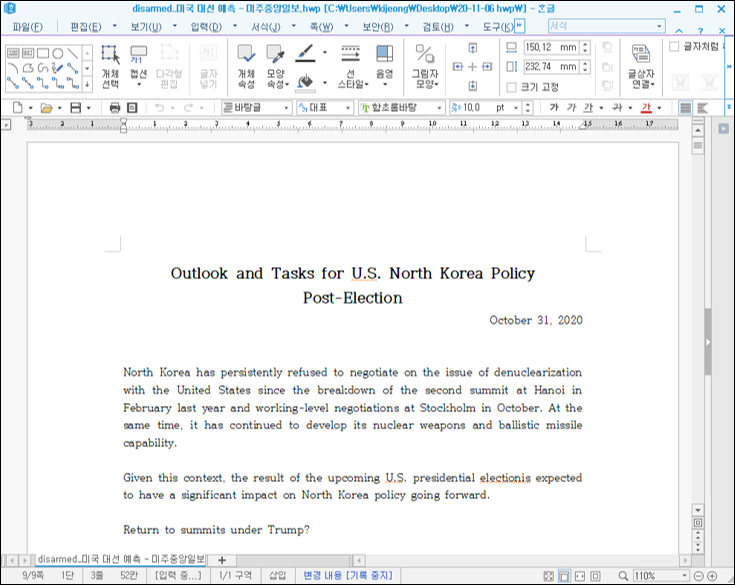 해당 한글문서는 악성코드를 포함하고 있었지만 새니톡스를 통해 무해화 된 후에 한글파일이 정상적으로 열리고 그 내용도 확인할 수 있습니다.