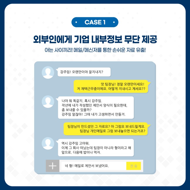 두 사람의 대화를 살펴보면 B군은 재택근무 상태였고, 기업의 중요 문서를 쉽게 접근하여 외부인이 된 과거 동료에게 너무도 쉽게 기업정보를 메일로 보낼 수 있었다는 점입니다.