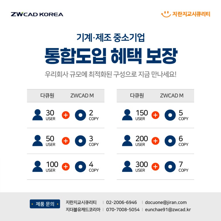 다큐원 for ZWCAD M은 기계·제조 분야의 중소기업 규모에 맞춘 구성을 다양하게 제공합니다. 해당 구성으로 도입하실 경우 실제 도입비용의 30% 할인된 금액으로 두 솔루션을 원스텝으로 이용하실 수 있습니다.