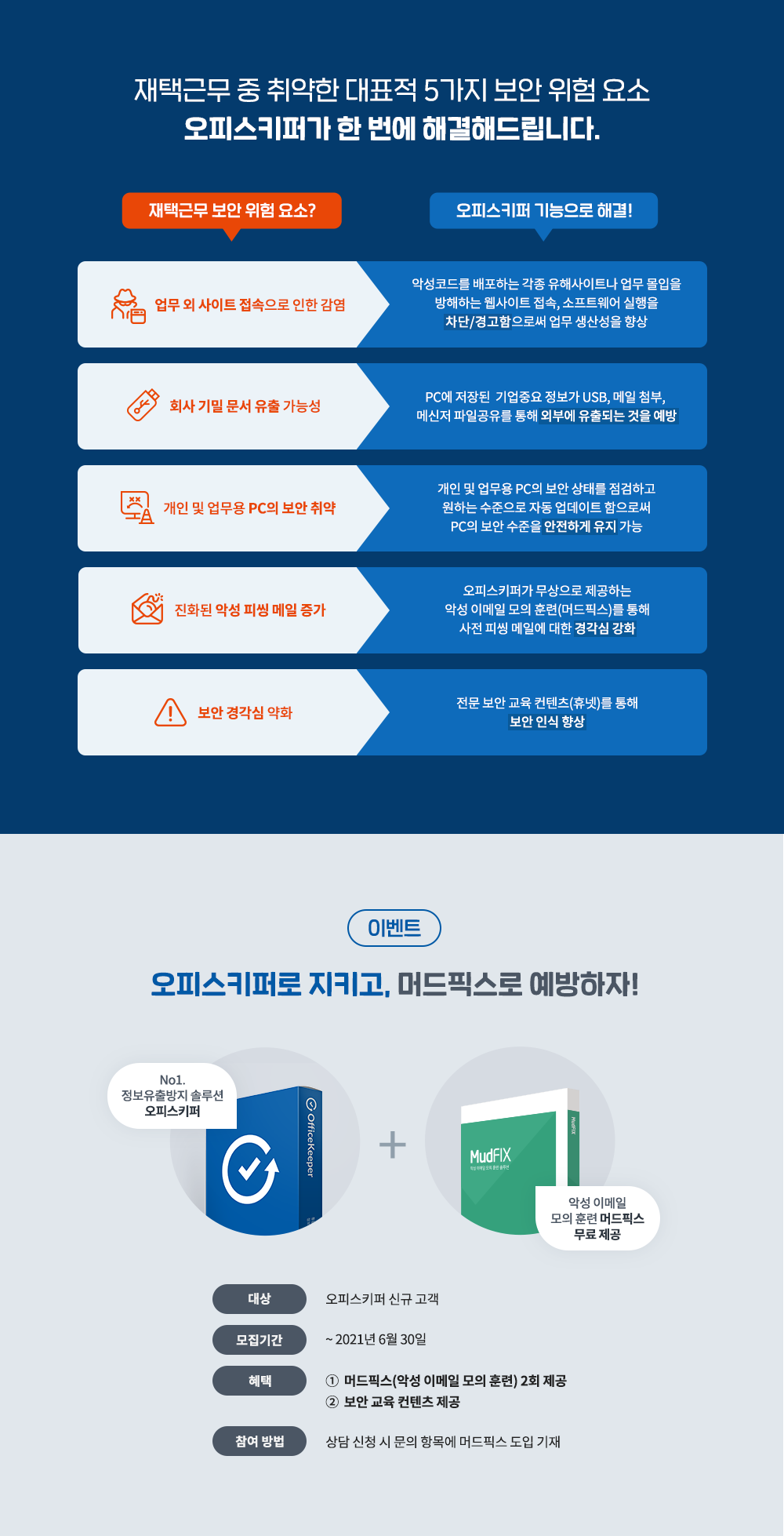 '재택근무 보안 프로모션'은 재택근무 중 우려되는 보안 위험 요소에 대응 할 수 있도록 통합 PC보안이 가능한 정보유출방지(DLP)솔루션 오피스키퍼와 악성 이메일 모의 훈련 솔루션 머드픽스, 보안 교육 콘텐츠를 제공해 재택근무 중 사용하는 PC의 보안은 물론 보안 사고의 사전 예방 효과도 기대할 수 있다.