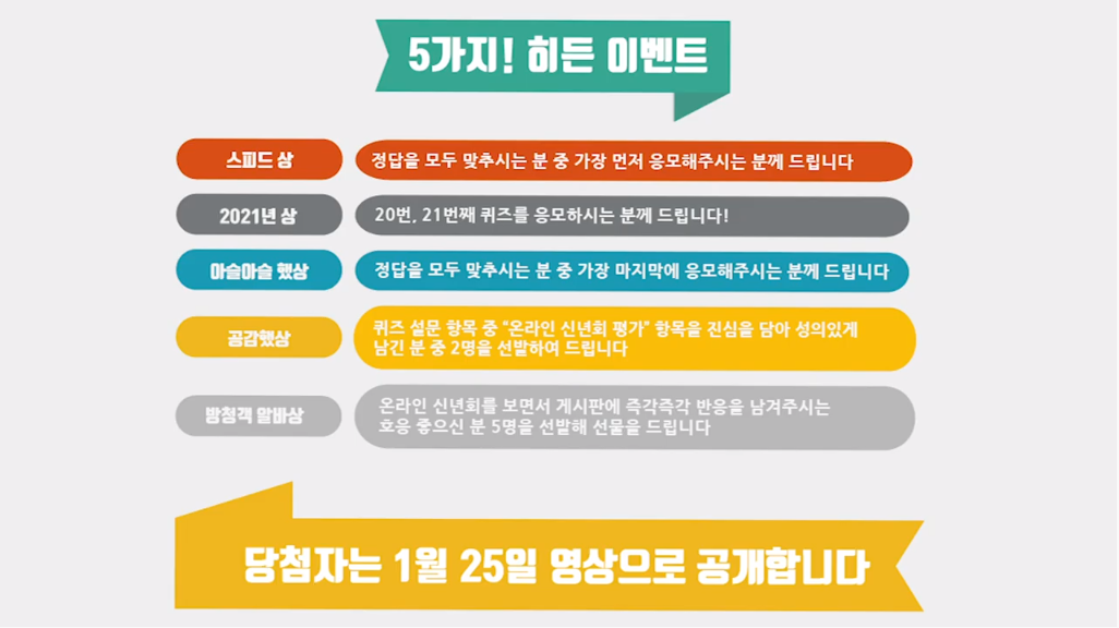 지란지교소프트 2021 온라인 신년회(시무식)에는 발표자 10명이 선정한 10개의 선물 외에도 스피드상, 2021년상, 아슬아슬했상, 공감했상, 방청객 알바상 등 히든 이벤트 진행으로 더욱 풍성한 선물이 준비되어 마지막까지 보는 재미를 더했습니다.