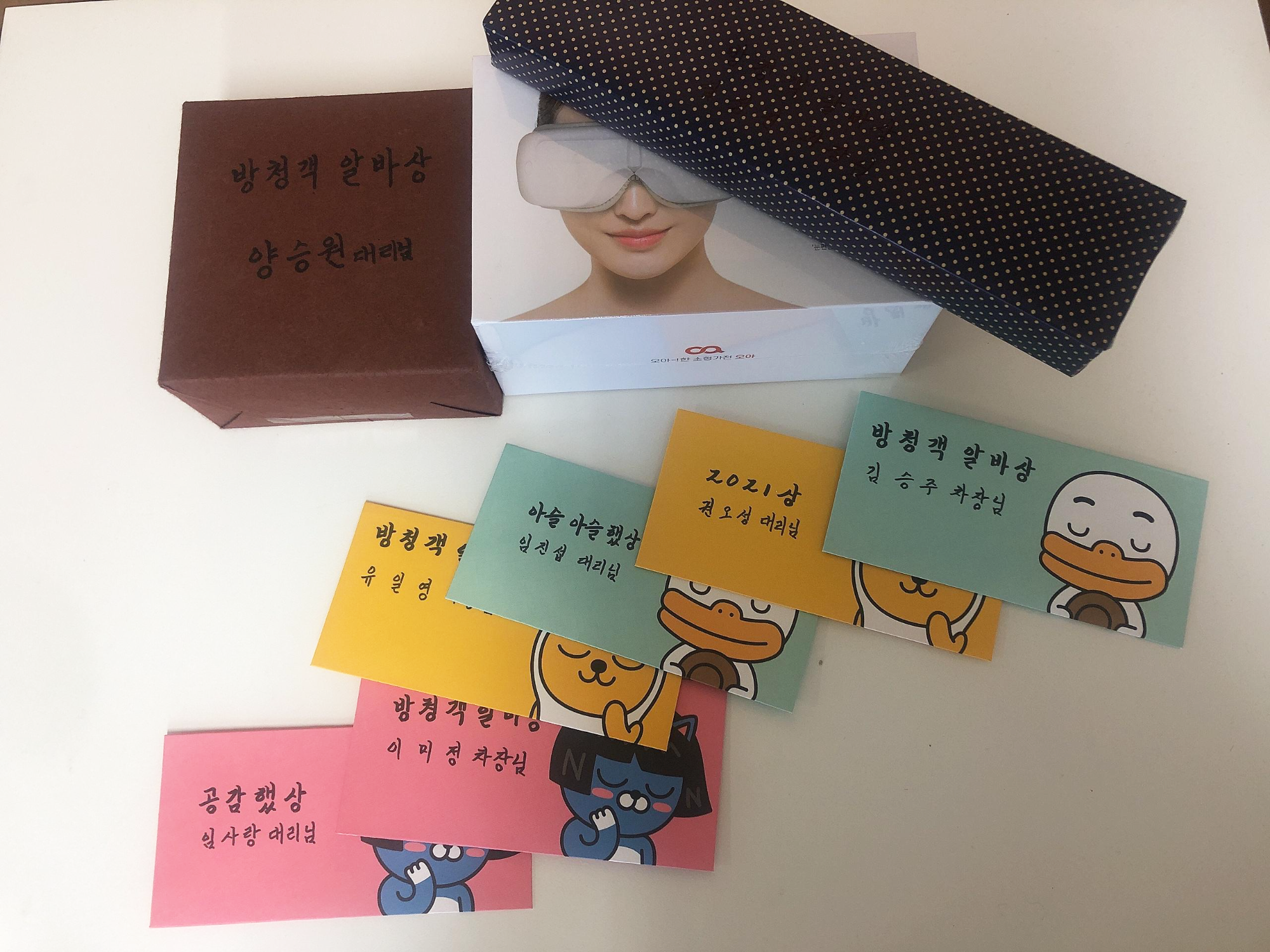코로나19로 인해 모두 모여 사진을 찍는 대신, 대전(본사)-서울(지사)에 근무하는 지란인 모두가 선물을 받은 후 인증샷으로 이를 대신했는데요 :) 구글미니홈, 전동칫솔, 에어프라이기, 무선마우스, 무선이어폰, 블루투스 스피커, 눈 마사지기, 상품권 등! 알찬 상품에 당첨된 모두가 흡-족!