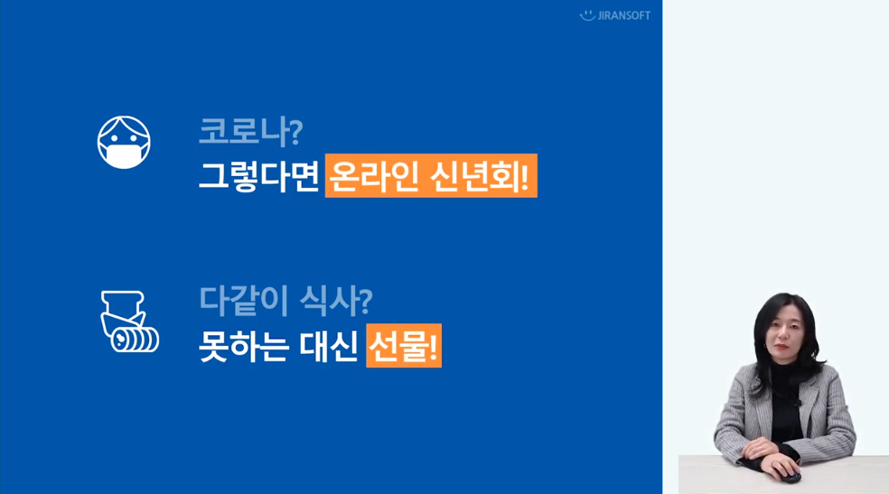 코로나19로 인해 사회적 거리 두기에 동참하는 만큼 모두가 모일 수 없는 대신, 2020년을 돌아보고 올해 우리가 나아가야 할 방향을 공유하고자 준비한 2021 지란지교소프트 온라인 신년회(시무식)!