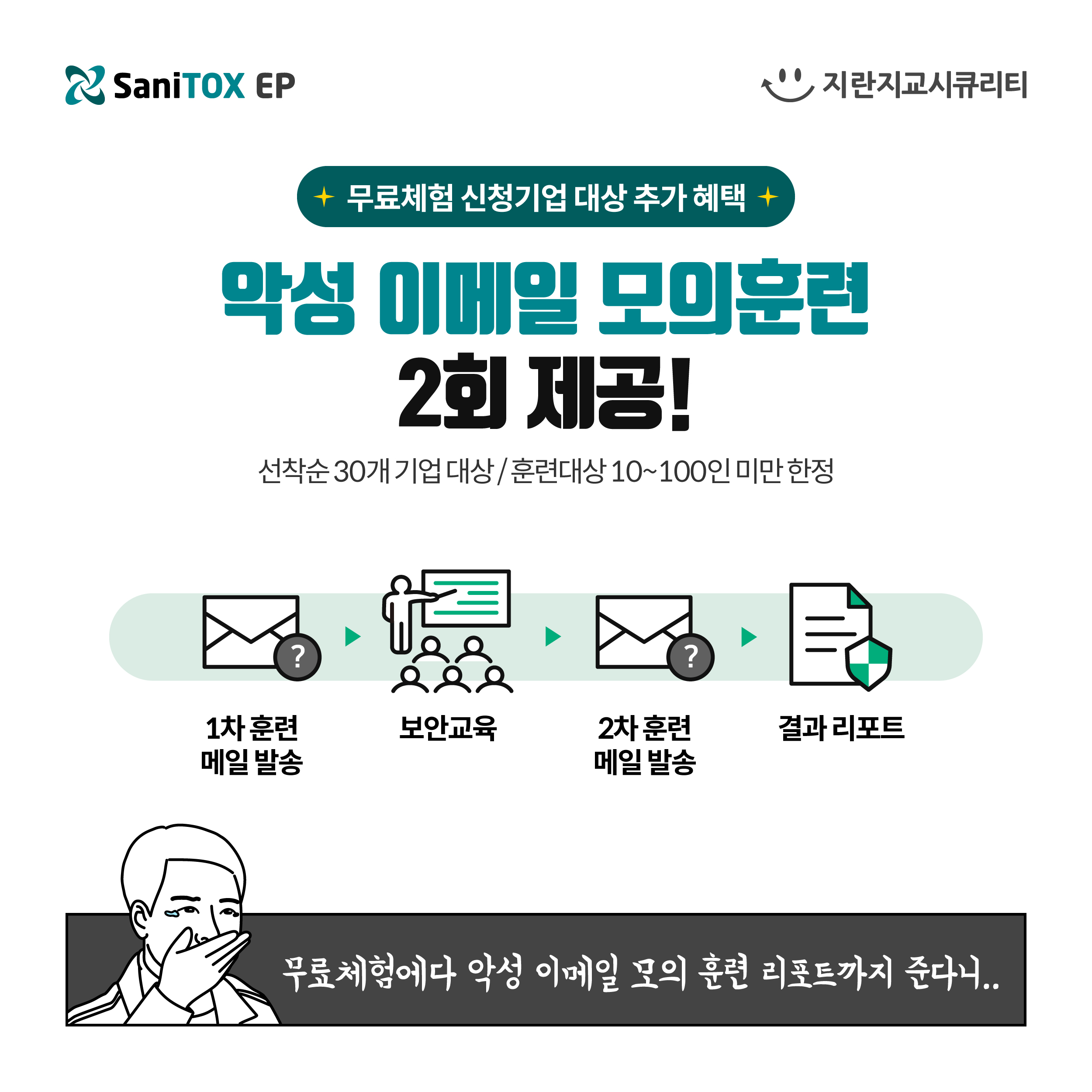 악성 이메일 모의 훈련은 악성 이메일과 동일한 포맷을(안전하지만, 페이크로다가) 훈련 대상자에게 발송해서 우리 직원 중에 누가 보안인식과 교육이 필요한지 알 수 있도록 모의 훈련하는 서비스예요. 1차와 2차 훈련 결과를 비교해서 걸리는 사람이 또 걸렸으면, 지못미… 계속 훈련해 나가면서 보안에 대한 경각심과 평소의 보안 인식을 바꾸는 교육하는 것이 가장 중요해요! 사실 많은 보안 솔루션들이 넘쳐나는 세상이지만, 가장 중요한 보안해결책은 ‘사람’이예요. 사람을 대상으로 보안인식을 개선해 나가는 서비스를 바로 새니톡스 EP 론칭 기념으로 제공해요! 자 30개 기업 선착순이니 얼른 신청하세요!!