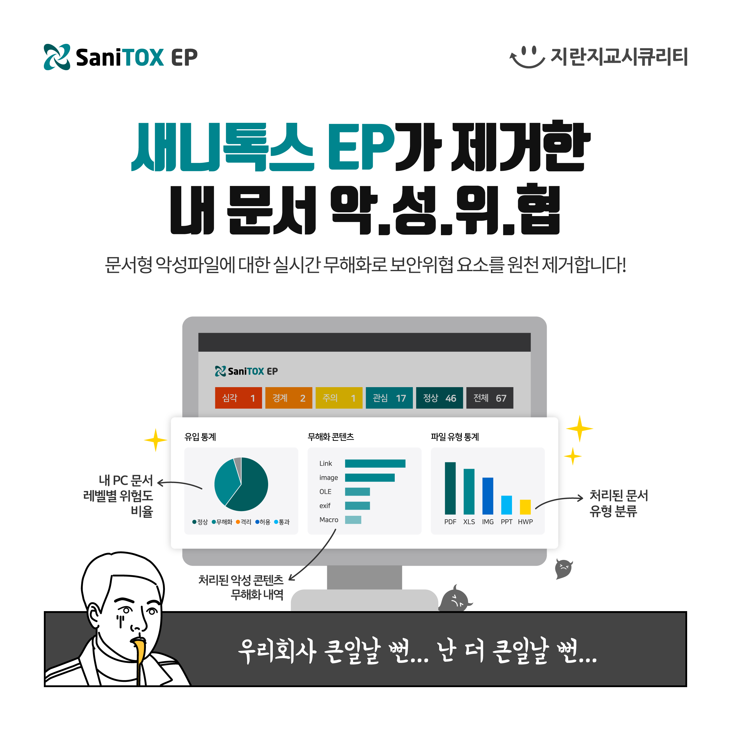 이렇게만 하여 24시간 내내 PC에 있는 모든 문서의 악성위협은 제거됩니다. 기존에 있던 파일부터 새롭게 다운받아 열어보는 파일까지. 원본파일과 동일한 콘텐츠를 유지하며, 악성요소만 쏙쏙 제거해버린다는 거죠. 사실 기술적으로 이야기 하자면, 새니톡스 EP 엔진을 거치는 모든 문서들은 백신검사를 거친 후 쫘악 분해된 뒤 위협요소를 제거한 뒤, 다시 원본과 동일한 형태로 재조합 합니다. 여기서 위협요소라 함은 엄청 다양해요. 매크로, 액티브 콘텐츠, OLE* 객체 등 이러한 모습으로 지능적으로 악성위협이 평범한 파일에 심겨져 있어요.