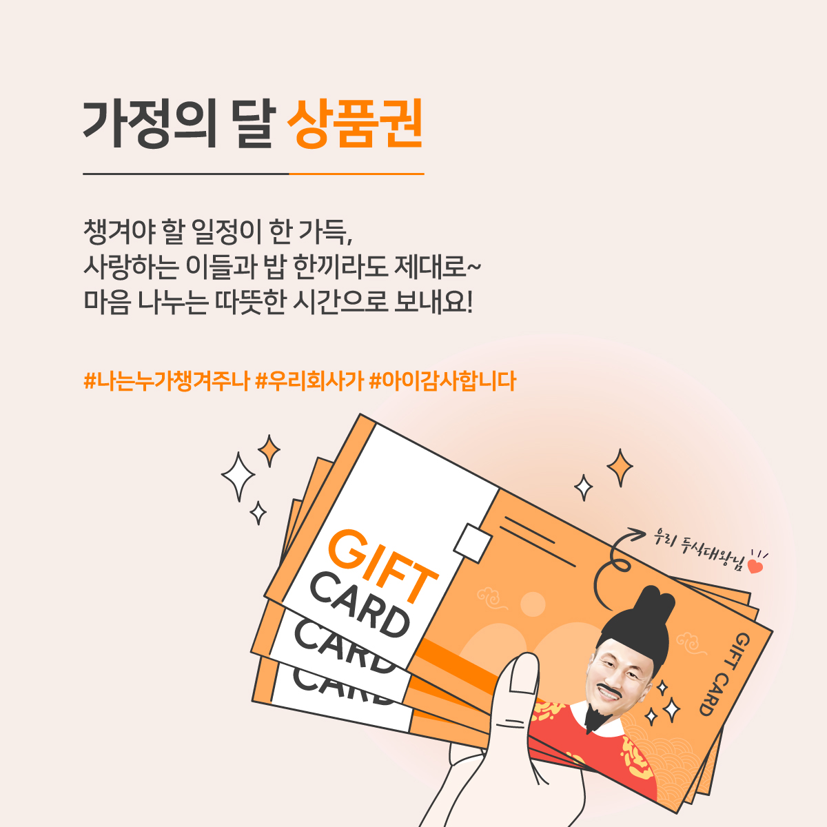 챙겨야할 일정이 가득한 5월, 회사에서 보내는 따뜻한 마음을 상품권으로 받아요. 지출이 유난히 많은 5월, 이 상품권이 우리 임직원들 마음에 위로가 되시길!