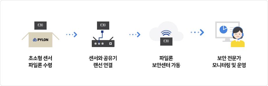 구독을 신청하신 고객은 초소형 센서를 받게 됩니다. 보안이 필요한 장소의 공유기에 랜선을 연결하고 전원을 키면 끝! 그 초소형 센서에서 수집한 데이터는 클라우드 센터에서 보안 전문가가 관리합니다.