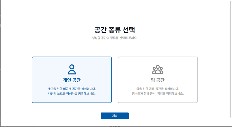 개인 공간과 팀 공간에 대한 정의 및 소개를 각각의 아래에 간략히 소개하여 사용자 혼란의 여지를 최대한 줄이고 직관적인 설명으로 빠른 이해를 돕습니다. 이렇듯 친절한 안내는 비단 로그인 단계에서 뿐만 아니라 오피스노트 서비스 이용 중 항상 경험하실 수 있는 오피스노트만의 강점입니다.