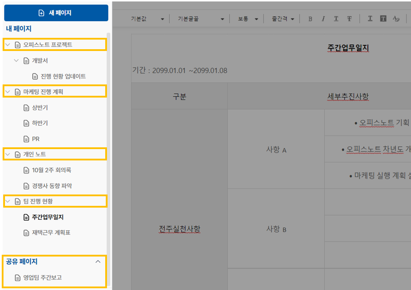 직접 작성하는 페이지는 '내 페이지'에서 작성 및 공유 권한을 부여해 협업할 수 있으며, 유관 그룹/팀의 업무 문서 또는 회사 공지와 같은 전체 열람이 필요한 문서는 '공유페이지' 내 구분 표기되어 한눈에 식별이 가능하고 열람이 가능합니다.