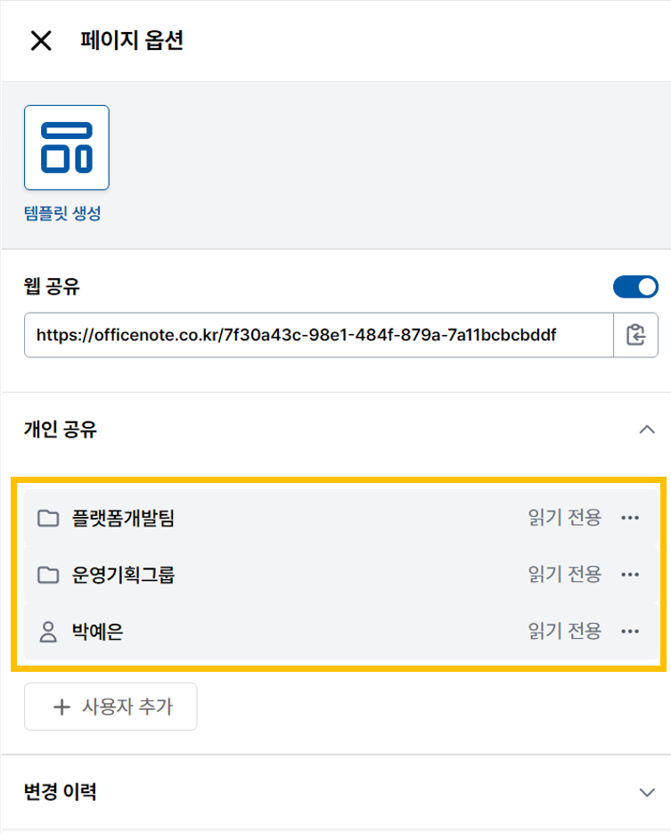 | 2. 문서 공유 시 조직도 기반 특정 개인/팀/부서/그룹별 공유는 물론 웹 링크로 게스트까지 공유할 수 있는 오피스노트 |