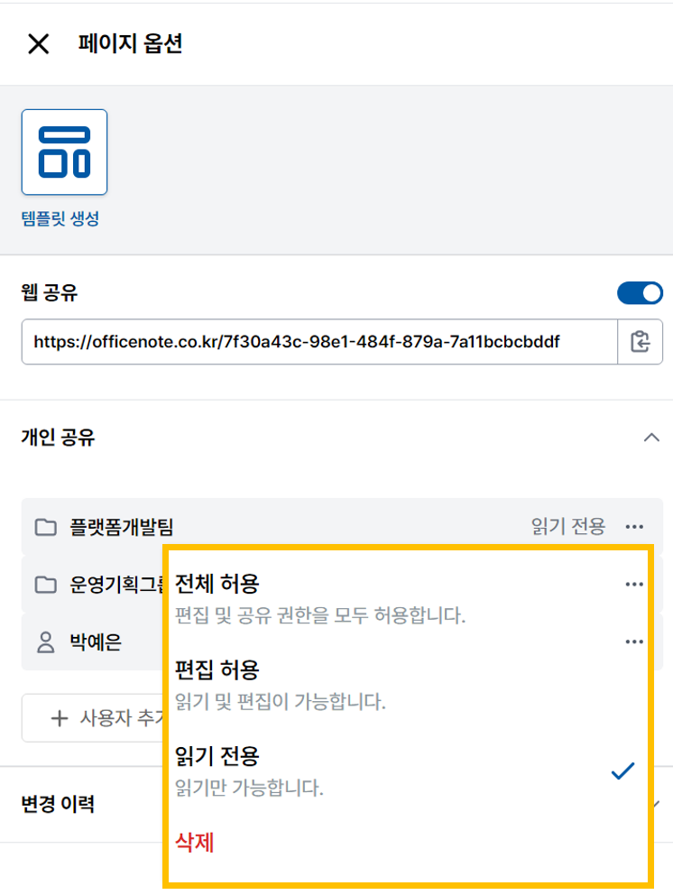 | <공유 유형 4가지> 1. 전체 허용: 편집 및 공유 권한을 모두 허용합니다. 2. 편집 허용: 읽기 및 편집이 가능합니다. 3. 읽기 전용: 읽기만 가능합니다. 4. 삭제: 공유를 취소합니다. |
