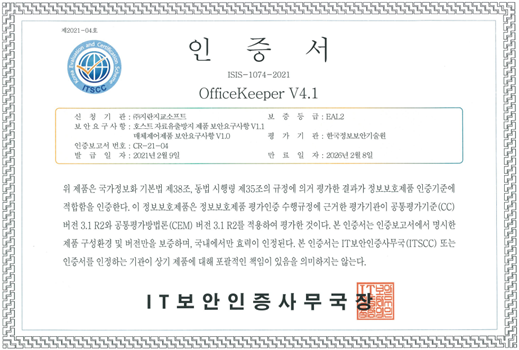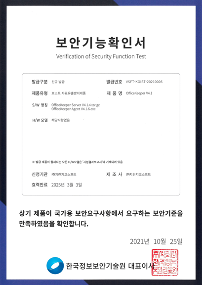 통합PC보안이 가능한 정보유출방지 솔루션 오피스키퍼는 2021년 CC인증(만료일:2026년2월8일),보안기능확인서(만료일:2025년3월3일)를 취득 및 갱신하며 기술력을 인정받았습니다.
