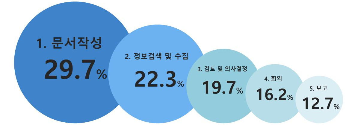 한국 생산성본부가 직장인 473명을 상대로 설문조사를 실시한 결과에 따르면, 직장인이 전체 업무 시간 중 시간을 많이 할애하는 업무는 무려 1순위가 문서 작성(29.7%), 이어 정보 검색 및 수집(22.3%), 검토 및 의사결정(19.7%), 회의(16.2%), 보고(12.7%) 순으로 시간을 할애하는 것으로 나타났습니다.