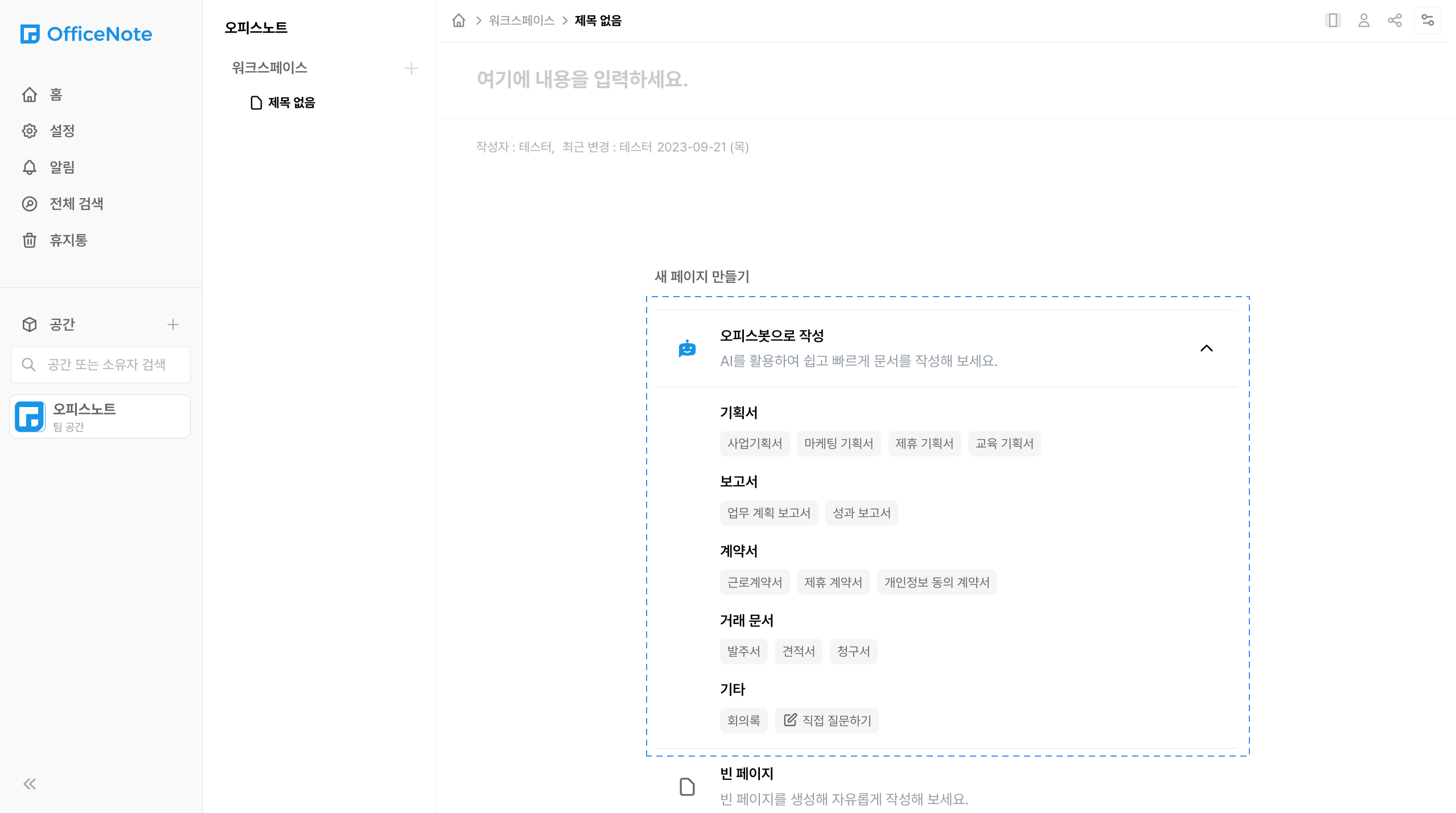 오피스노트는 오피스봇을 이용한 문서 작성부터 템플릿, 보드 페이지 기능들을 제공해주고 있는데요! 오늘은 이 중 요즘 가장 핫한 챗GPT 활용한 '오피스봇'을 소개드리도록 하겠습니다!