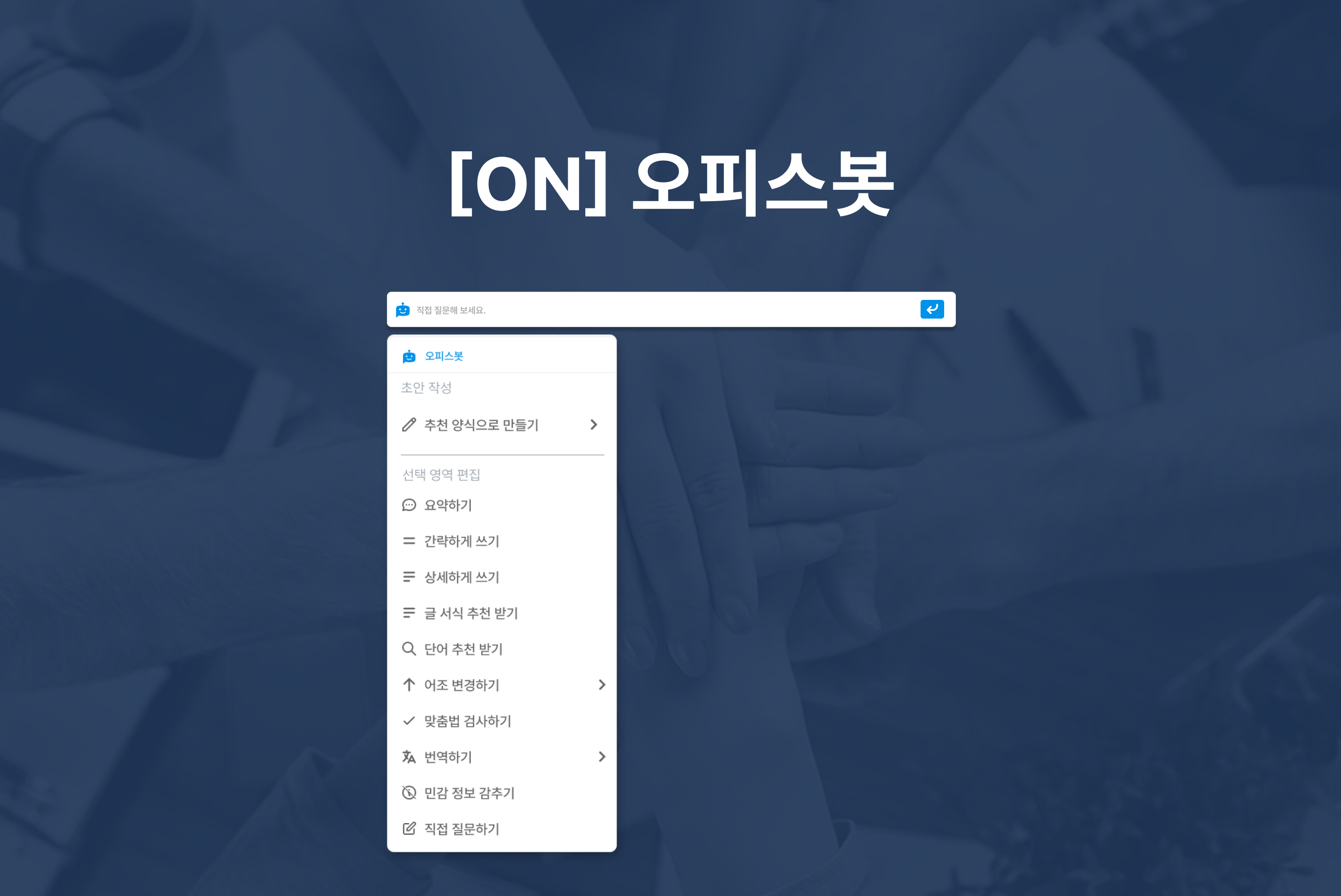 오피스노트에서 제공하는 오피스봇은 챗 GPT와 연동된 AI 기능으로, 문서를 더욱 쉽게 작성할 수 있도록 도와주는 역할을 합니다. 사람들이 문서를 작성할 때 어려움을 겪는 상황들을 분석하여 문서 작성 전, 작성 중과 작성 후로 나누어 기능을 제공하고 있습니다.