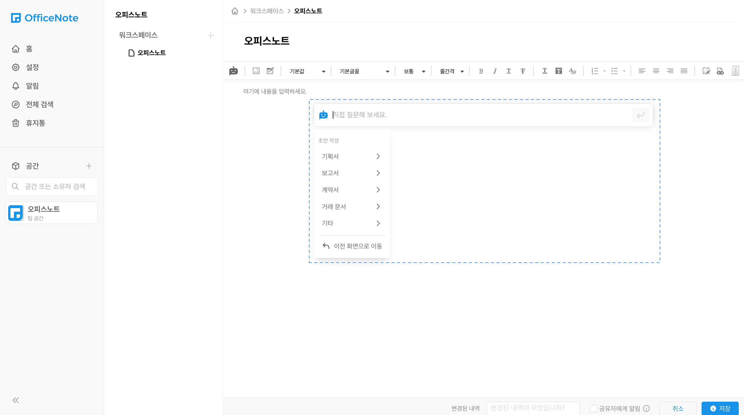 기획서, 보고서, 계약서 등 필요한 양식을 선택하면 챗 GPT에게 질문하여 답변을 받을 수 있습니다. 이 기능을 통해 문서의 초안을 좀 더 쉽게 작성할 수 있게 되었습니다!