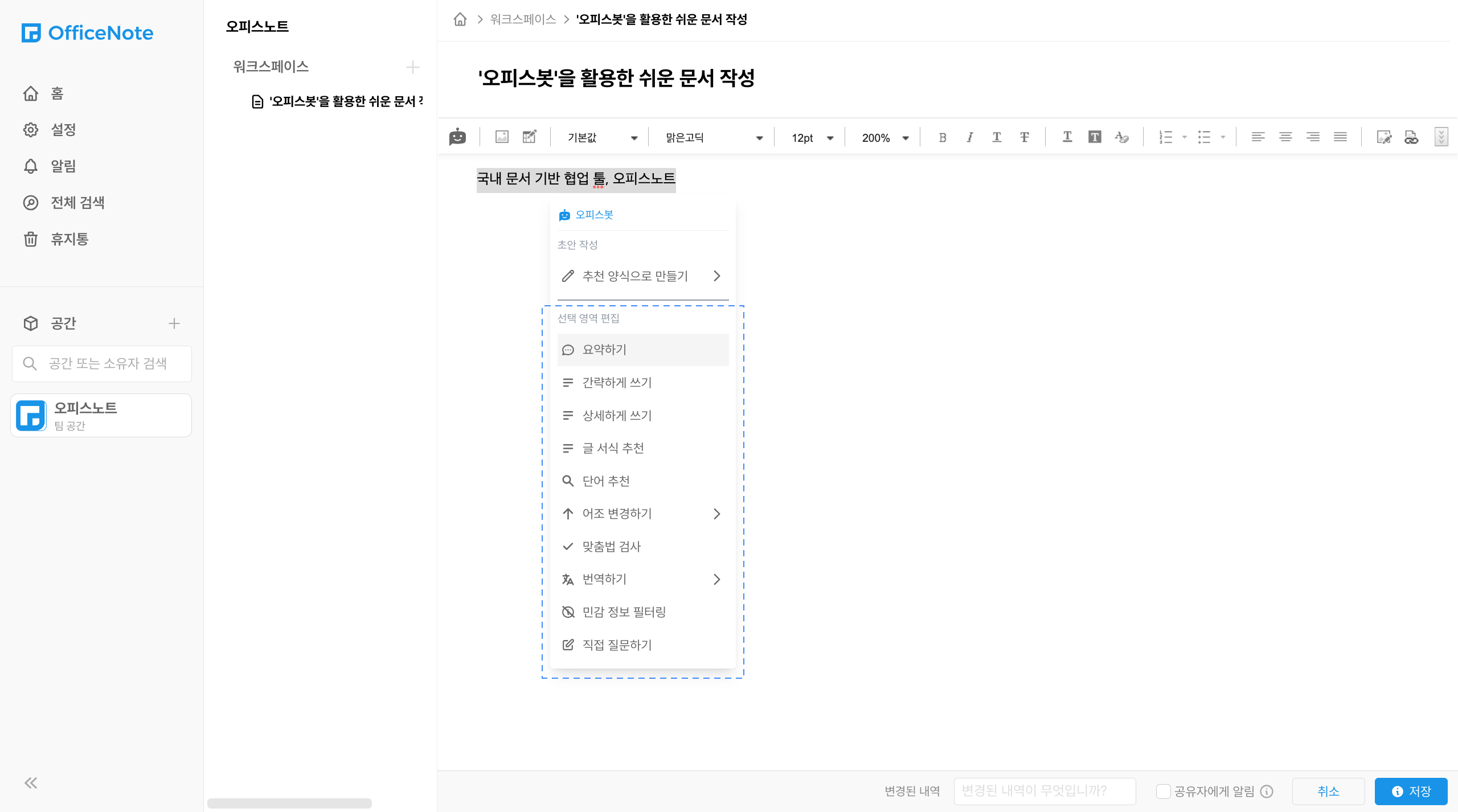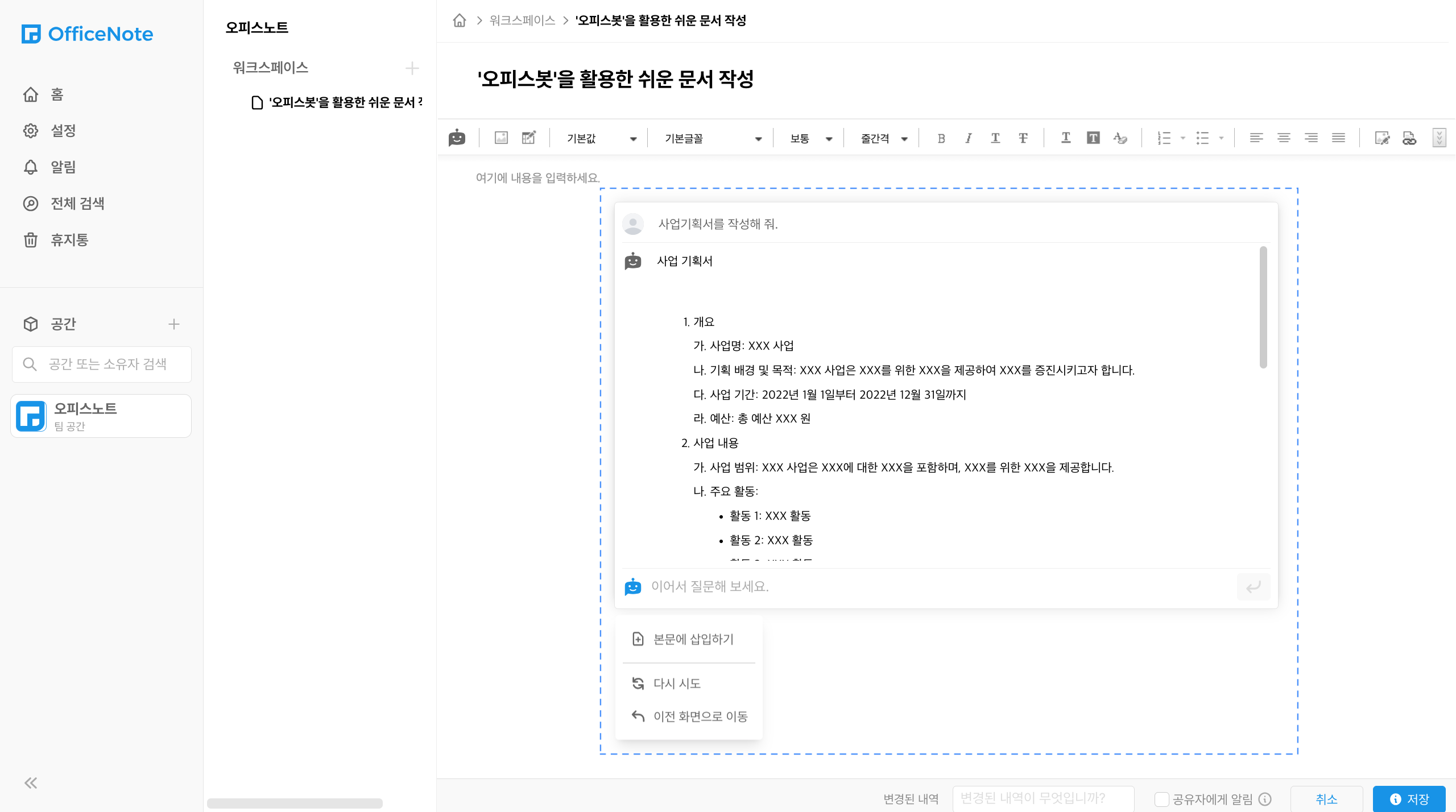 오피스노트에서 제공하는 오피스봇은 챗 GPT와 연동된 AI 기능으로, 문서를 더욱 쉽게 작성할 수 있도록 도와주는 역할을 합니다. 사람들이 문서를 작성할 때 어려움을 겪는 상황들을 분석하여 문서 작성 전, 작성 중과 작성 후로 나누어 기능을 제공하고 있습니다.