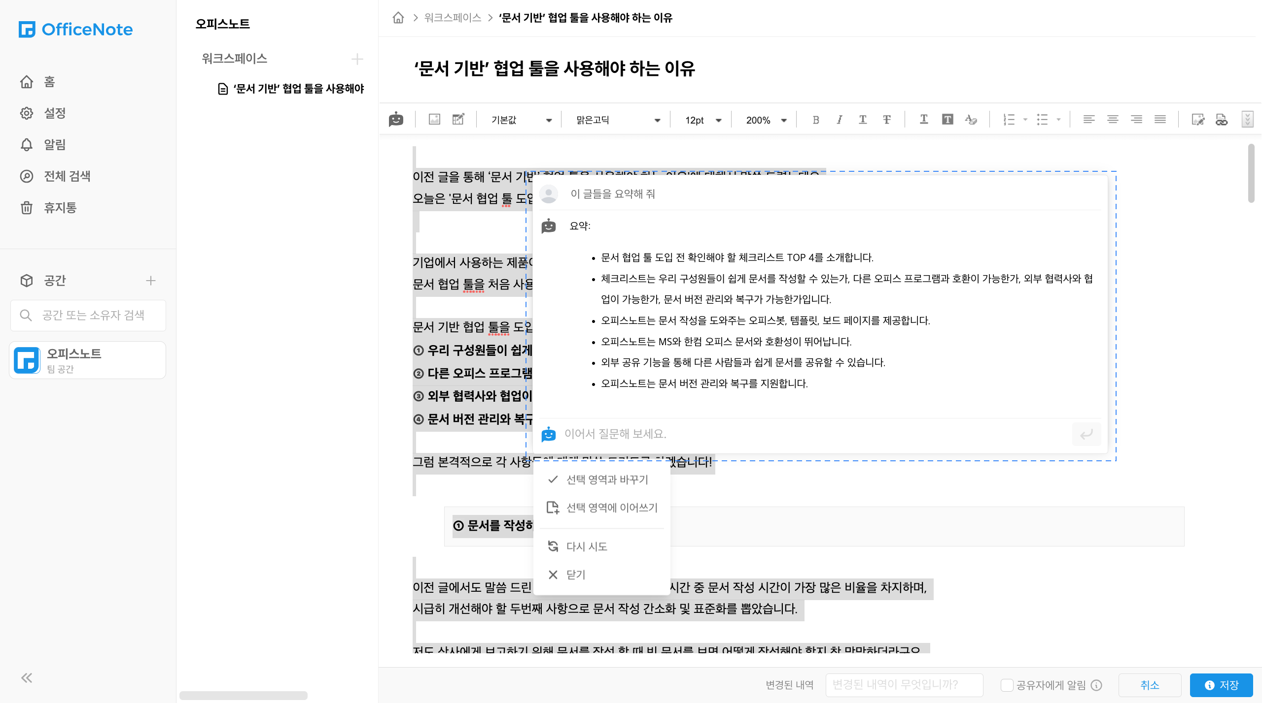문서 작성 중 또는 작성 후 - 요약하기, 맞춤법 검사하기 등 다양한 편집 기능 제공