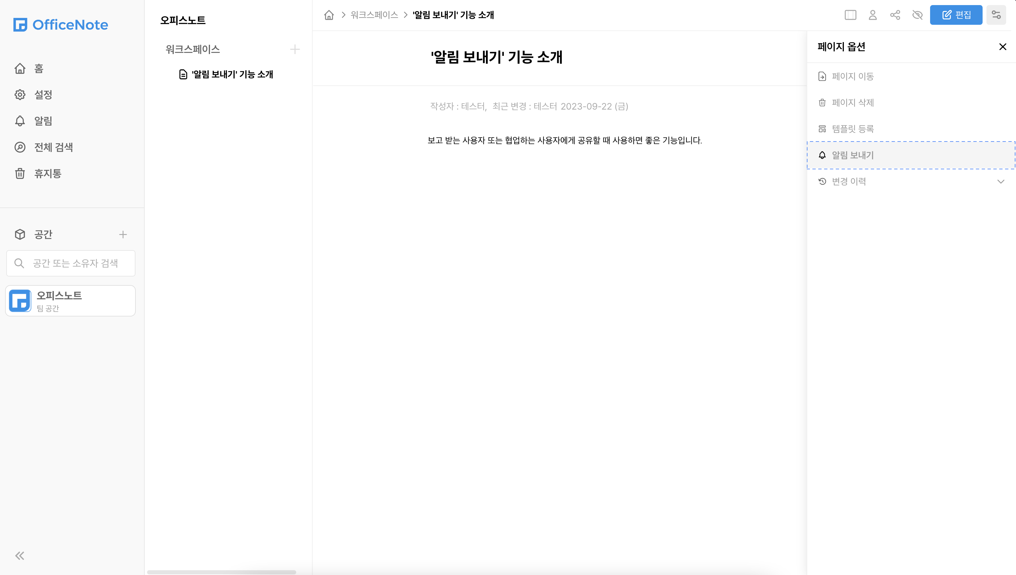 '알림 보내기'는 페이지를 편집하는 사용자가 공유를 받고 있는 사용자에게 편집 또는 읽기 모드에서 수동으로 편집 완료 알림을 발송하는 기능입니다. 상사에게 보고하거나 협업 중인 관계자들에게 편집 완료 상태를 알려줄 수 있는 유용한 기능이에요!