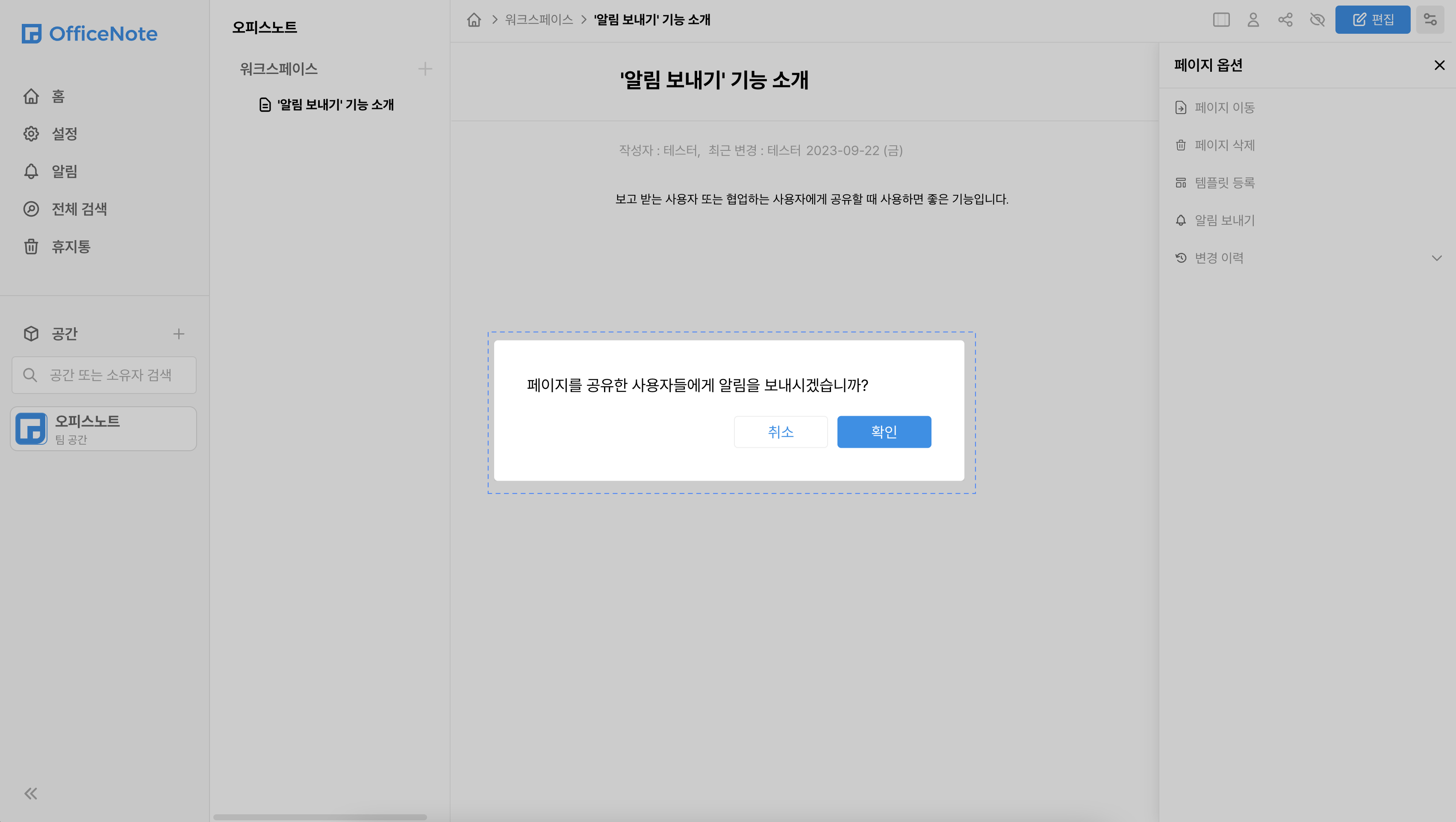 그래서 페이지를 작성하는 사용자도, 공유 받는 사용자도 꼭 필요한 알림만 주고 받을 수 있도록 '알림 보내기' 기능이 만들어졌습니다!