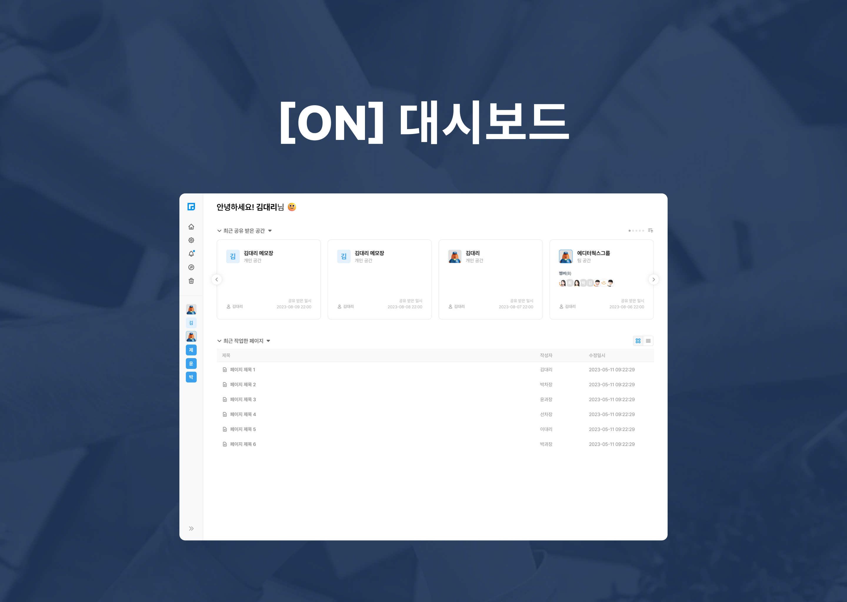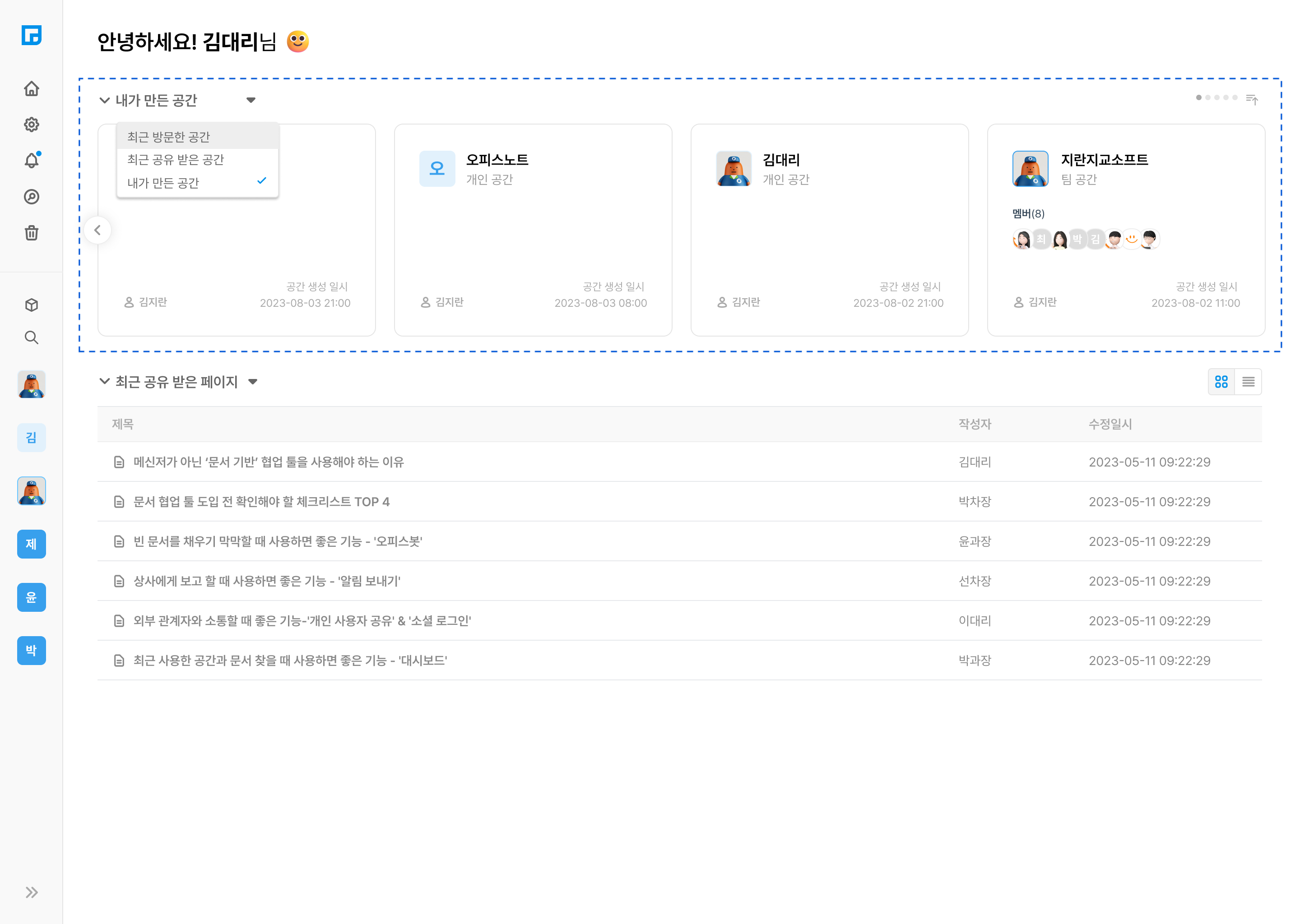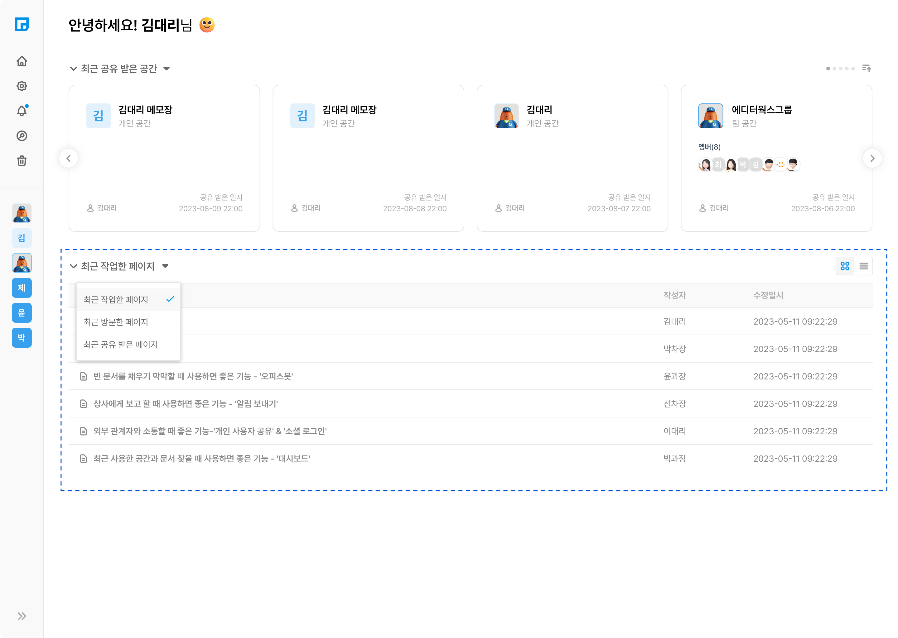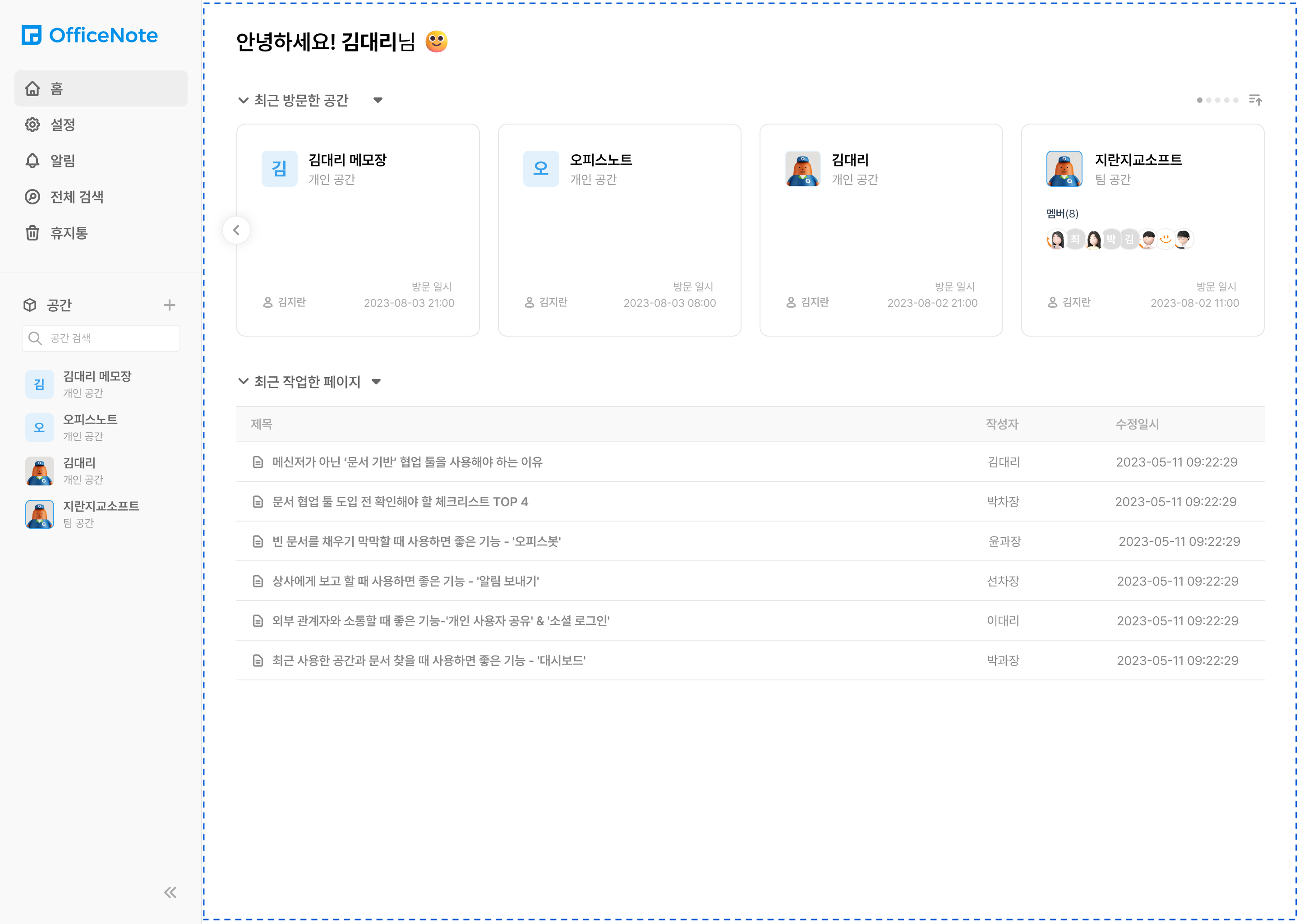 하지만 오피스노트를 사용하고 부터는 이런 고민들을 안하게 되었습니다! 왜냐하면 오피스노트에서는 '대시보드' 기능을 이용하여 최근 방문하거나 공유 받은, 그리고 작업하고 있던 페이지와 공간에 쉽게 접근할 수 있기 때문입니다!